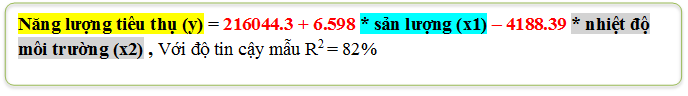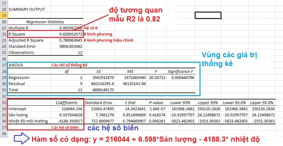 1. Ta có kết quả tính toán như hình dưới, trong đó trong phạm vi bài toán của mình cần chú ý một số chỉ số sau: R Square :Độ tương quan mẫu R2(độ tương quan càng cao, các kết quả từ đường csnl càng chính xác, R2>0.7 là đạt) Coefficients:Hệ số mẫu( là các hệ số của hàm số trong đó Intercept là hệ số nền)