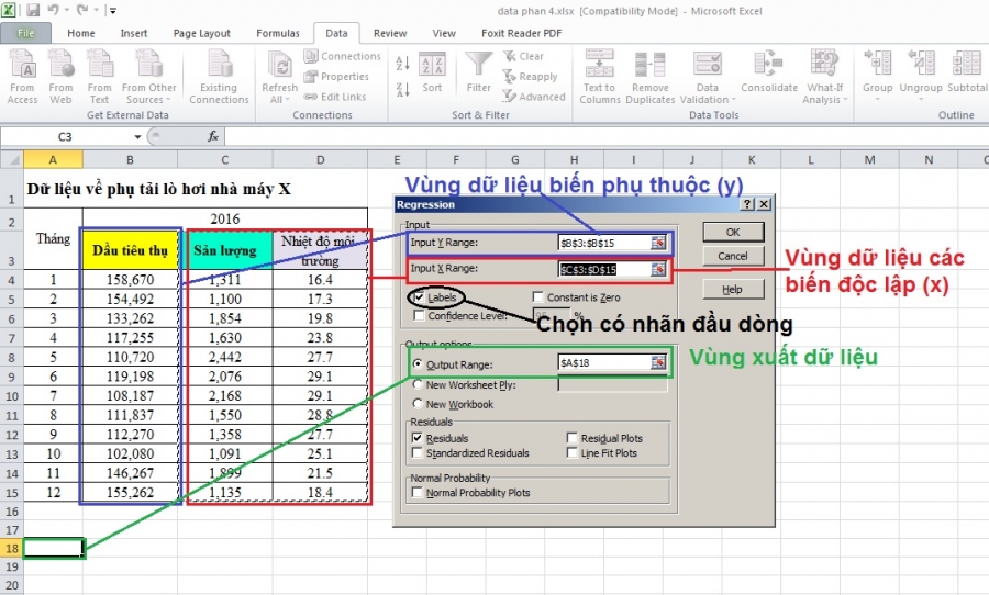 2. Nhập dữ liệu theo hướng dẫn trong đó: Input Y Range: Vùng chứa biến phụ thuộc (chọn vùng chứa biến phụ thuộc – bao gồm cả tên biến) Input X Range: Vùng chứa các biến độc lập chọn vùng chứa các biến độc lập – bao gồm cả tên biến) Labels: Chọn để có sử dụng tên biến Confidence Level: Độ tin cậy (1-a), mặc định 95%, Output Range: Vùng xuất dữ liệu.